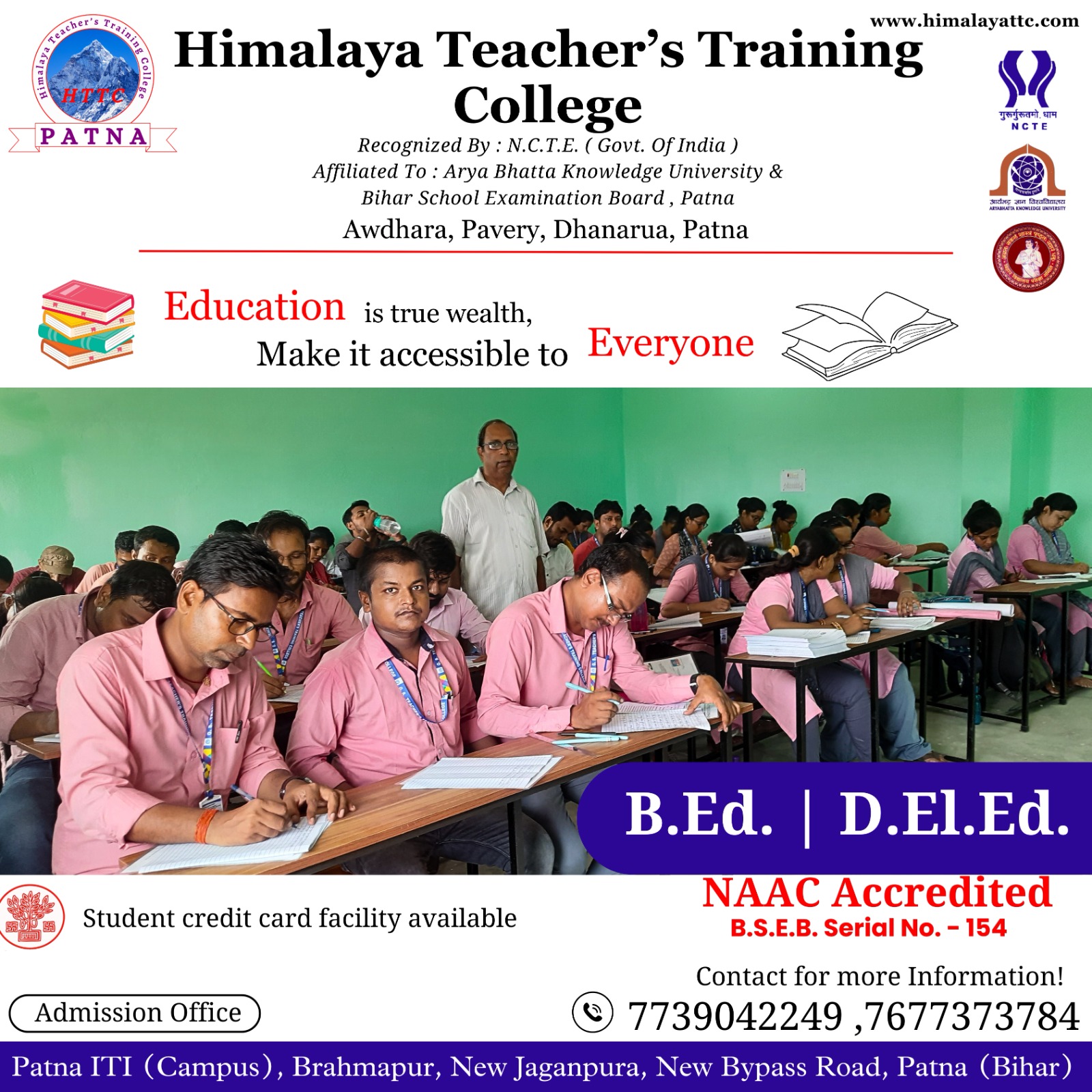 Himalaya Teacher's Training College has sponsered by Himalaya Educational Trust is founded by a group of social workers, professionals to promote education and welfare of the young and impressionable minds of the state of Bihar with its office at Ebrahimpur, Awdhara, P.O.- Pavery, Dhanarua, Patna - 804451 (Bihar).